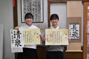 第10回佐久全国臨書展(主催・長野県佐久市など)の授賞式がこのほど、長野県で行われ、蒼海書道会・池田書道塾の平良由子さん(久松小6年)が最高賞の天来賞に輝いた。安田凪紗さん(南小6年)が市書道連盟賞に選ばれた。11日、池田書道塾で入賞者報告会があり、2人が喜びを語った。同会からは特選や金賞など計21人が入賞した。 同展は、近代で古典学書の方法論を確立した佐久市出身の書道家・比田井天来を顕彰し、古典体系を現代の書の原点として臨書を改めて問い直すことなどが目的。今回は全国から3557点の応募があった。