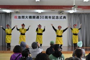 式典は池間大橋会の「宮古トーガニ」で幕開け。優雅な舞で式典に花を添えた。最後は「池間大橋」の踊りを披露し、幕を閉じた。