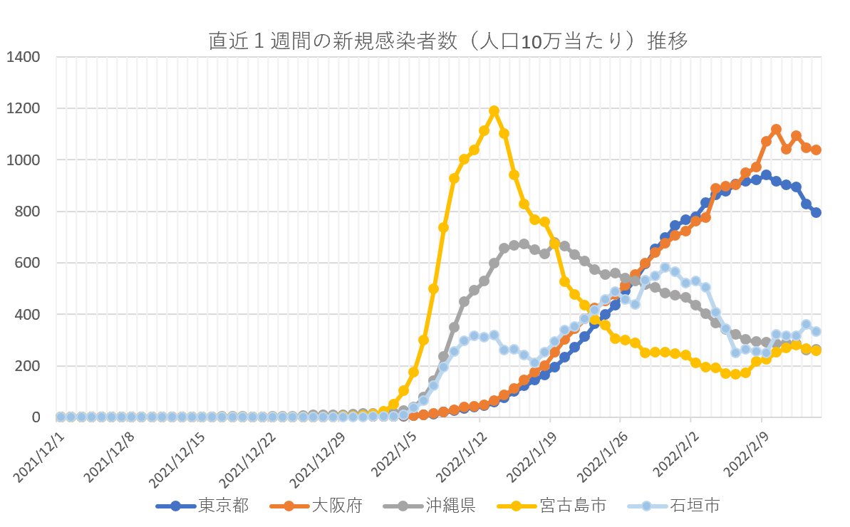 【速報・新型コロナ】14日、直近1週間の新規感染者(人口10万人当たり)