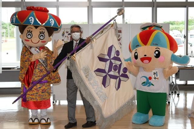 10月22日から11月27日に開催される「美ら島おきなわ文化祭2022」を広く県民に周知させることなどを目的に、県内市町村で大会旗を展示する巡回広報大会旗リレーが14日から宮古島市で始まった。同日、市役所でセレモニーが行われ、座喜味一幸市長に大会旗が受け渡された。大会旗は18日まで市役所に展示される。