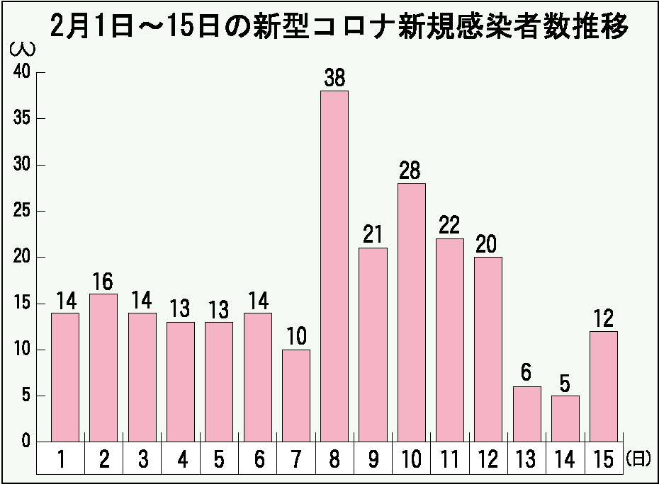 1日から15日までで1日の新規感染確認者が最も多かったのは8日の38人で唯一の30人台となった。20人台は9日から12日までの4日間。10人台は1日から7日までと15日の8日間。1桁台となったのは13、14の2日間のみだった。