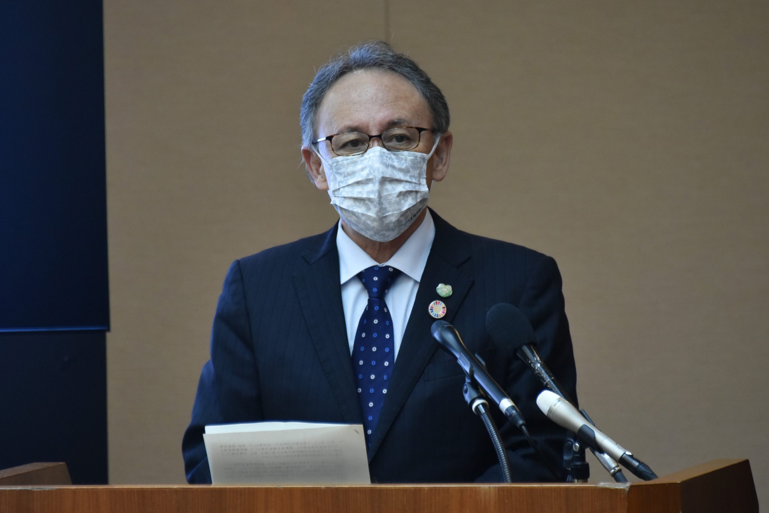 玉城デニー知事は16日、県庁で会見を開き、新型コロナウイルス感染防止対策として20日を期限に適用されている「まん延防止等重点措置」について、政府に延長を要望しないと発表した。一方で、玉城知事は県内の感染状況について「油断できる状況ではない」と指摘し、感染対策の継続を訴えた。