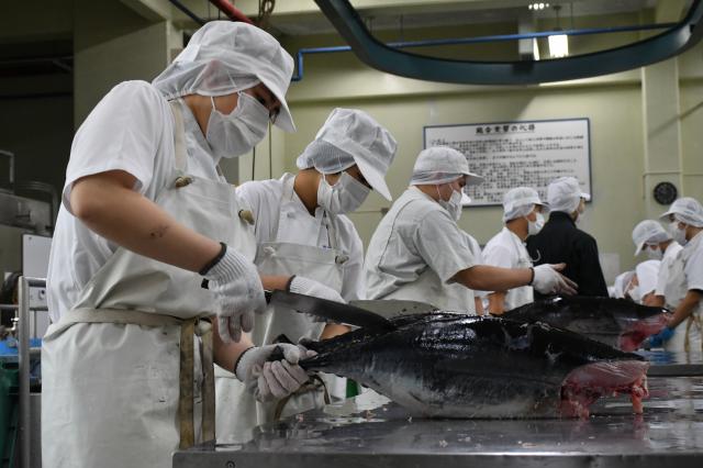 宮総実でツナ缶製造実習/マグロ解体に生徒奮闘