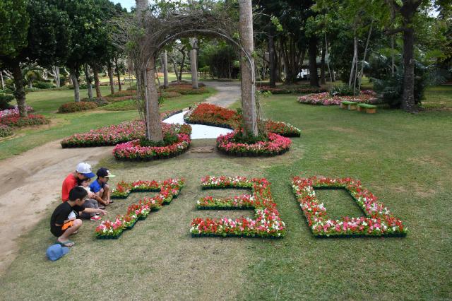市熱帯植物園に新たな花絵と花文字が登場した。復帰50周年を記念し「730(ナナサンマル)」の標識を模しており、訪れた市民の目を楽しませている。