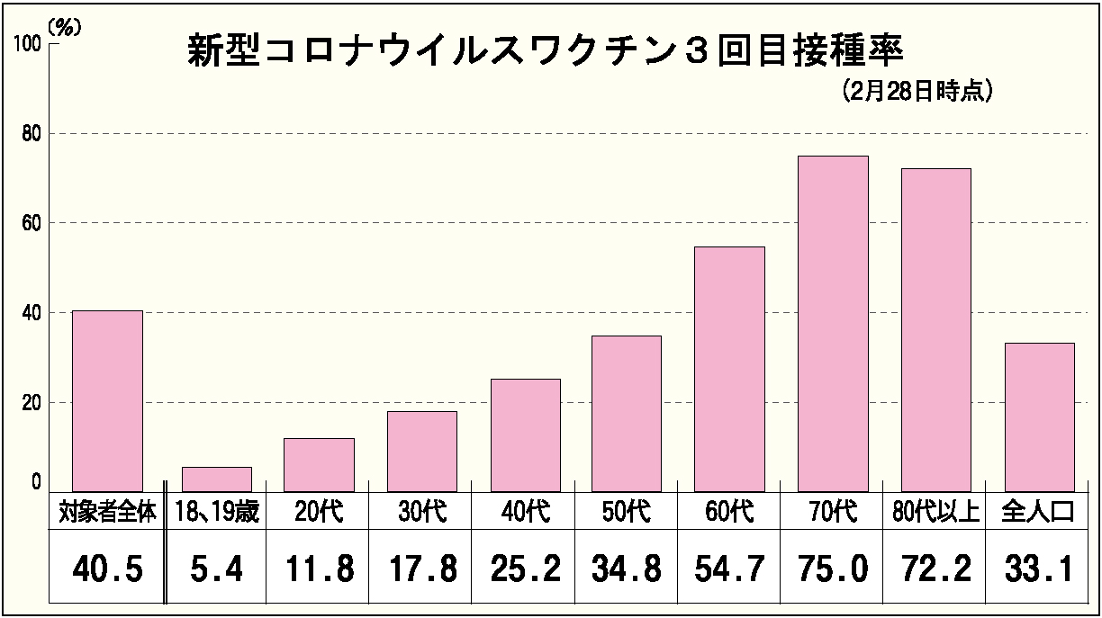 3回目接種率を年代別で見ると、最も高いのは70代の75・0%、次いで80歳以上の72・2%と、70歳以上では70%を超えている。60代は54・7%で半数以上が接種を終えている。
