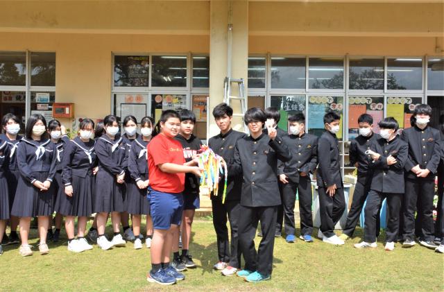 鏡原小(前泊一郎校長)の6年生40人が4日、鏡原中(天久康校長)を訪れ高校受験を控えた3年生39人の合格を祈願して千羽鶴を贈った。6年生を代表して佐久本真翔君と長濱心君が折り鶴を手渡し、受験生の新里秀哉さんと狩俣宏箕さんが受け取り感謝した。