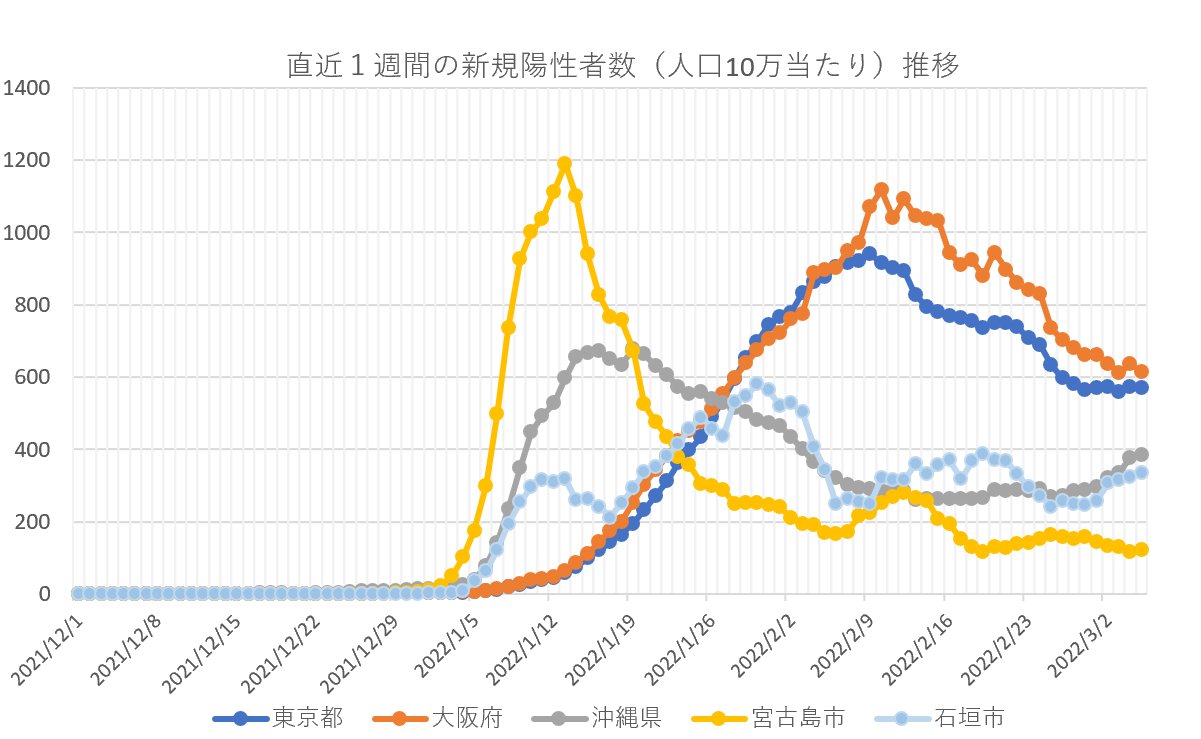 【速報・新型コロナ】5日、直近1週間の新規陽性者(人口10万人当たり)