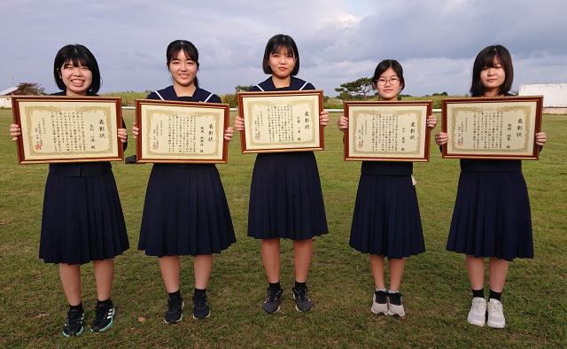 下地地区地域づくり協議会(川満好信会長)による2021年度優秀児童・生徒への表彰式が6日、旧市役所下地庁舎前の池原農村公園で行われ、スポーツや文化活動などで活躍した中学生5人に賞状が贈られた。