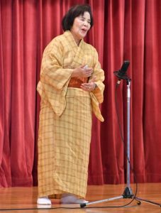 「おきなわの心 恩師・金井喜久子をうたう│新城悦子/喜寿を記念して」(主催・放課後児童クラブぐすくべ)が6日、城辺公民館で行われた。新城出身で同クラブ園長の新城さんが、金井喜久子が作曲した歌を披露した。会場には多くの市民が訪れ、新城さんの歌に聞き入っていた。