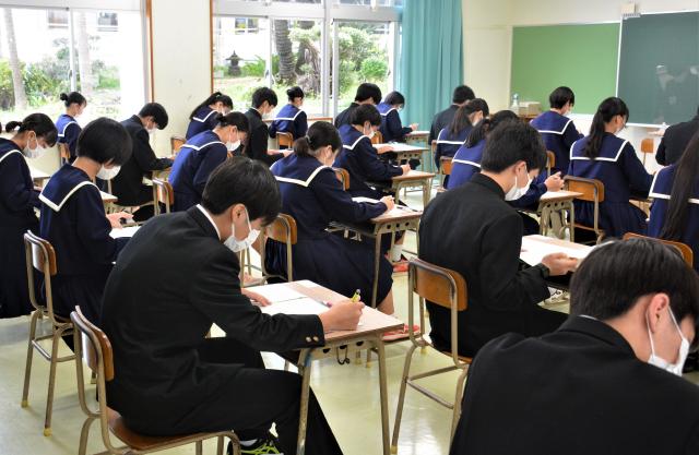 2022年度の県立高校入学者選抜(高校入試)が8日、宮古地区の3高校で始まった。3年連続コロナ禍での入学試験となり、今年はマスク姿の受験生378人が「15の試練」に挑んだ。