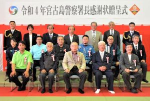 宮古島警察署(田場義浩署長)は11日、警察業務に積極的に協力した11団体、31個人に感謝状を贈った。贈呈式が同署3階武道場で開かれ、田場署長から受賞者へ賞状と記念品が手渡された。