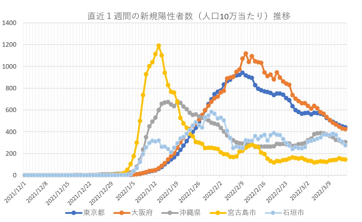 【速報・新型コロナ】14日、直近1週間の新規陽性者(人口10万人当たり)
