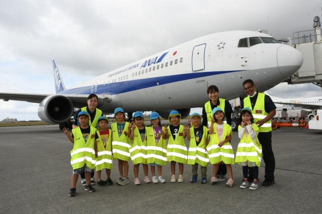 全日本空輸(ANA)宮古空港所は14日、うららか保育園(勝連聖史園長)を3月に卒園する6歳児9人ら招いての機体見学会を宮古空港で開催した。園児らは普段入ることのできない駐機場で大きな飛行機をバックに記念写真を撮影した。