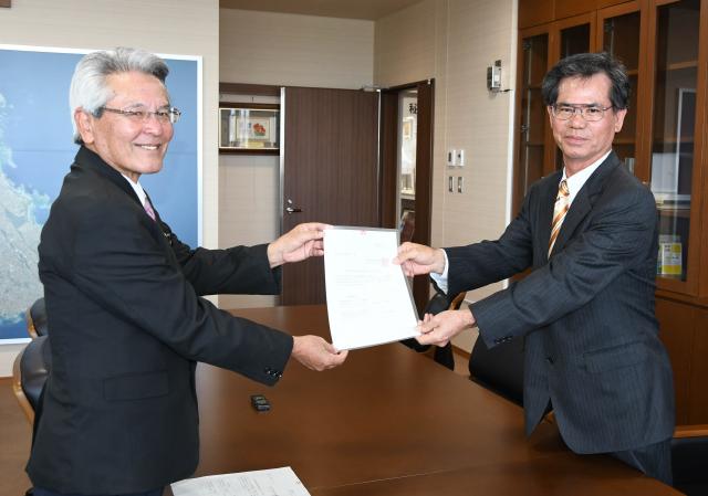 市長室を訪れた石原会長は、2月24日に協議会を開催し、審議の結果、限度額の引き上げは妥当との判断を行ったことを座喜味市長に報告し、答申書を手渡した。座喜味市長は「答申をしっかり受け止め、これからの行政に反映させていきたい」と語った。