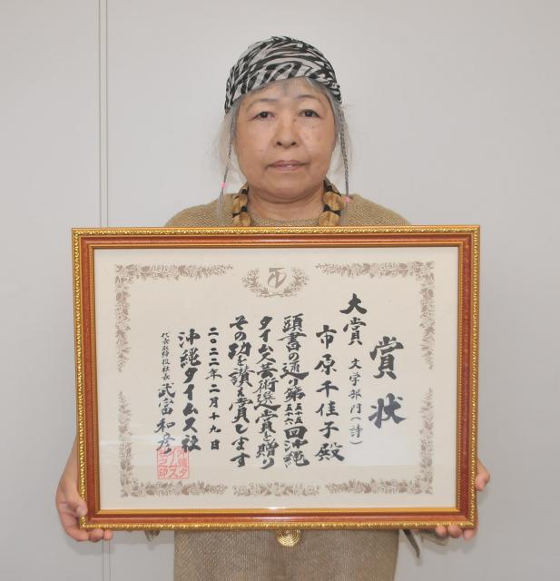 優れた芸術活動および芸術文化の向上に功績のあった個人、団体を顕彰する2020、21年度(第55、56回)沖縄タイムス芸術選賞に、市平良池間に住む市原千佳子さんが文学(詩)部門で大賞に選ばれた。市原さんは「毎日見ているものでも、ある日突然新しいものを発見する時がある。それを言葉で表現していきたい」と話し、読み手の想像力をかき立てる作品づくりへ意欲を示した。