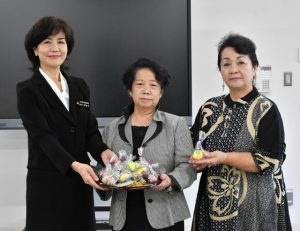 県交通安全母の会宮古支部(島尻清子支部長)は16日、市教育委員会に大城裕子教育長を訪ね、交通安全マスコットを贈呈した。新1年生の登下校の安全を願い、今年で20回目のプレゼント。島尻支部長は「車に気を付けて楽しい学校生活を送ってほしい」と話した。