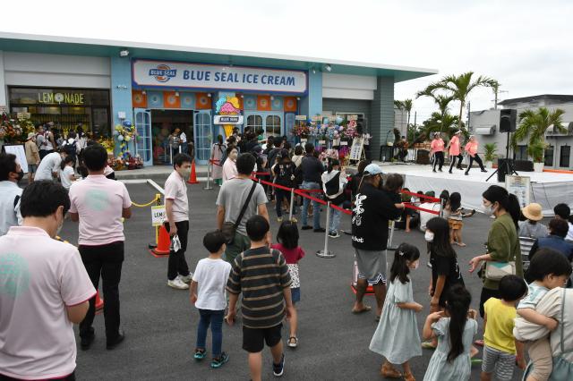 ブルーシール宮古島パイナガマ店とレモネードbyレモニカ宮古島パイナガマ店、両店舗のイートインスペースとなるアイススタンド385(ミヤコ)が19日、平良久貝に同時オープンした。開店を記念したステージイベントが行われ、地元のパフォーマーが踊りなどを披露しオープンに花を添えた。20日のイベント開催時間は午前11時と午後2時。