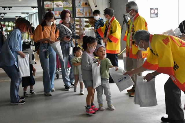 観光客が姿を見せると、「ようこそ宮古島へ」などと声を掛けながら、黒糖や消毒セットなどを詰め合わせた記念品を手渡した。
