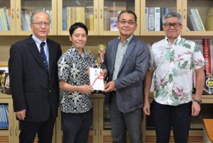 都一級建築設計事務所(垣花正昭社長)が1日、平良中学校(宮國幸夫校長)で創立70周年記念事業に役立ててと寄付金を贈呈した。同建築設計事務所の垣花晋さんから記念事業の成功を祈念して寄付金が贈られ、同事業期成会の佐平博昭会長が受け取り厚意に感謝した。佐平会長が運営する佐平土地家屋調査士事務所からも寄付金が贈られた。
