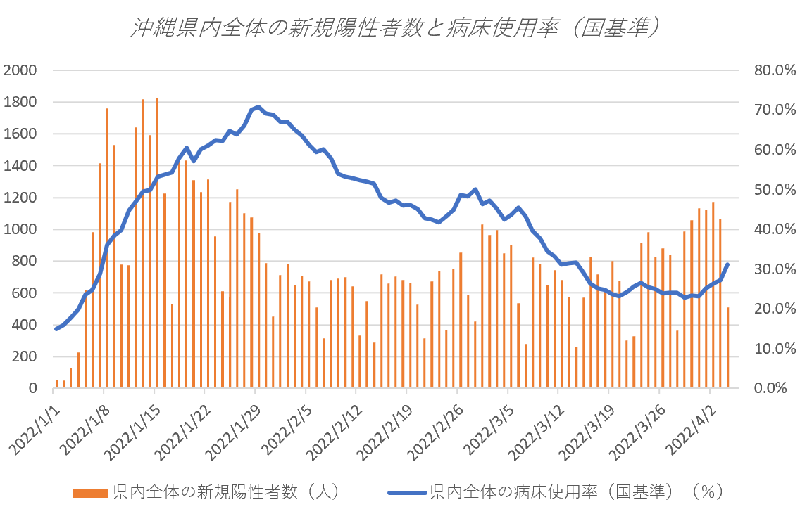 沖縄県内全体の病床使用率(国基準)31.2%、新規PCR検査の陽性率(直近1週間平均)15.8%。