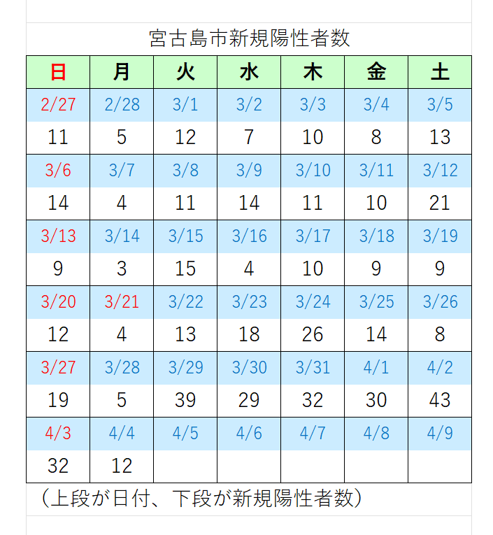 宮古島市内の新規陽性者数は、前週同曜日から7人増