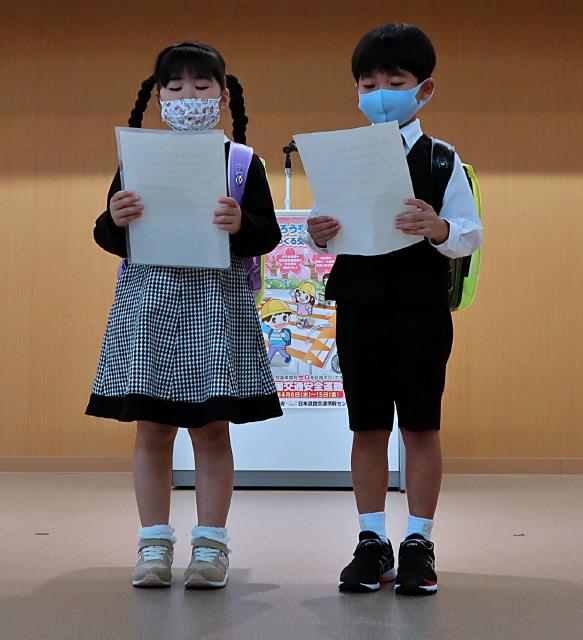 誓いの言葉では、新入学児童を代表して仲宗根悠真君(平良第一小学校)、與那覇芽依さん(同)が、横断歩道は大きく手を挙げて渡ることを誓うとともに、大人たちに対しても「お酒を飲んだら絶対に運転しないでね」と呼び掛けた。