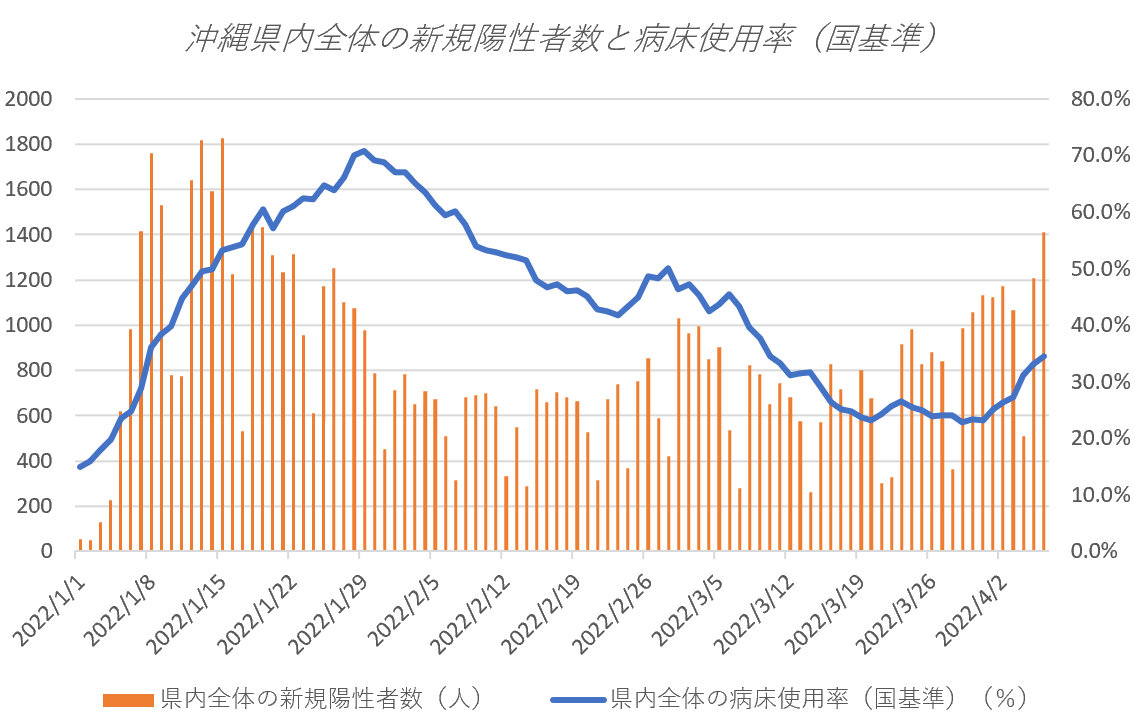 沖縄県内全体の病床使用率(国基準)34.4%、新規PCR検査の陽性率(直近1週間平均)15.1%。