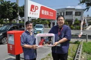 7日は活動をさらにアピールしようと平良久貝郵便局で那根豪局長と市社会福祉協議会の中村雅弘会長が善意を寄せた市民に感謝しながら、支援を呼び掛けた。