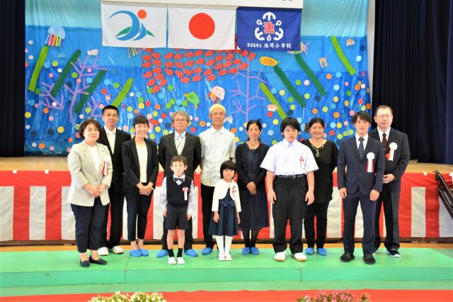 池間小中学校(平良吉嗣校長)の入学式が7日、同校体育館で行われた。小学校に三輪温意君、砂川葵さんの2人、中学校には久貝海鳳さんが新1年生として笑顔で仲間入りをし、在校生や保護者から歓迎を受けた。