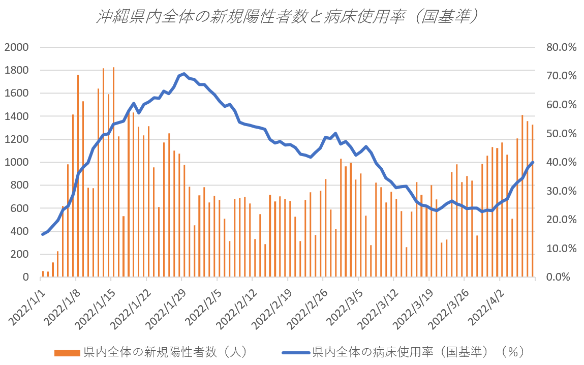 沖縄県内全体の病床使用率(国基準)39.9%、新規PCR検査の陽性率(直近1週間平均)16.9%。