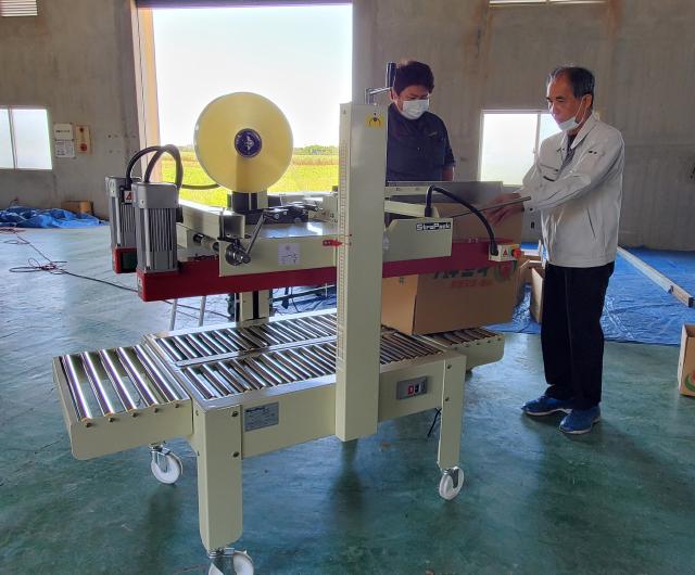 【多良間】JAおきなわ多良間支店(下地茂支店長)は4日、簡易型製封かん機(AS-323)を導入した。省スペース、省コストで段ボールの封かん作業を行うことができる機械で、農作物輸送時の効率化が図られると関係者らが喜んだ。同機械はしばらくカボチャやトウガンの箱を作るために使用される。