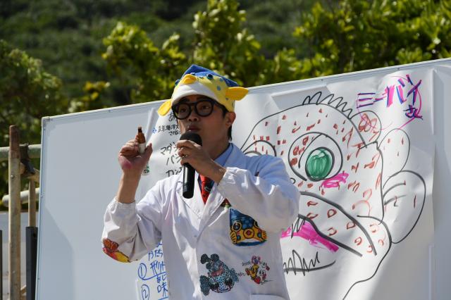 「ほっとけないプロジェクト~海辺のミライをみんなで守ろう」(主催・同プロジェクト実行委員会)が9日、新城海岸で行われた。タレントで東京海洋大学名誉博士・客員教授の「さかなクン」がスペシャルゲストとして出演し、宮古の海に生息する魚の特徴などをイラストと共に解説。宮古島の海の美しさを「宝物」と評し、海が美しいのは、自然が大切にされているからだと訴えた。