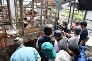 市山羊生産流通組合(新里聡組合長)が主催したヤギの飼養管理に関する講習会が9日、上野新里の新里組合長のヤギ舎で行われた。組合員や市職員などが参加し、獣医師の寺内光夫さんの話に耳を傾けるとともに、ヤギの発情を早め、早いサイクルで出産できるような手法を学んだ。