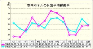 稼働率をホテル別に見ると、最も高かった施設で60・64%。以降は54・87%、47・97%、47・38%、47・23%と続く。5施設は30%台、3施設は20%台で、最も低かったところは20・10%だった。