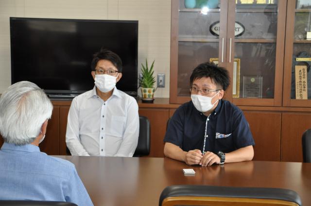 島唐食品(市上野宮国)の中嶋哲也社長と日本貿易振興機構(JETRO=ジェトロ)沖縄貿易情報センターの井瀧史洋所長が13日、市役所に座喜味一幸市長を訪ね、島唐食品がジェトロの発行する新輸出大国コンソーシアム・海外展開支援活用事例集に成功例として掲載されたことを報告した。