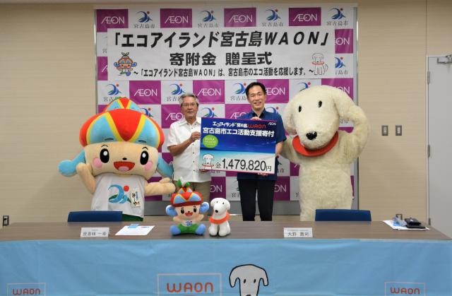 イオン琉球(本社南風原町、大野惠司社長)は15日、市役所で電子マネー「エコアイランド宮古島WAON」カードを利用して支払われた金額の0・1%に当たる、147万9820円を宮古島市に寄付した。大野社長から座喜味一幸市長に「環境保全などエコ活動に役立ててほしい」と目録が手渡された。