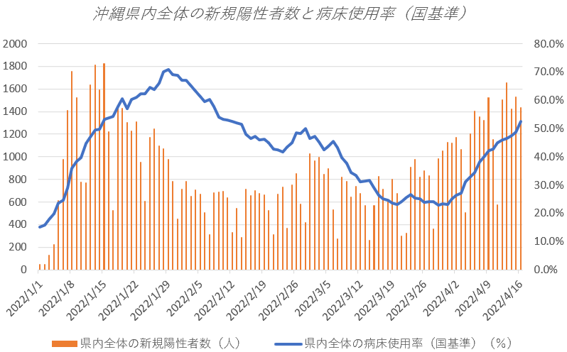 沖縄県内全体の病床使用率(国基準)52.4%、新規PCR検査の陽性率(直近1週間平均)15.9%