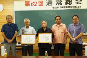 県建設業協会宮古支部(平良正樹支部長)の第62回通常総会がこのほど同支部で行われ、2021年度の決算や22年度の事業計画案、収支予算案などを審議し全会一致で承認した。また、長年にわたり同支部の発展に貢献したとして元支部長ら3人に感謝状が贈呈された。