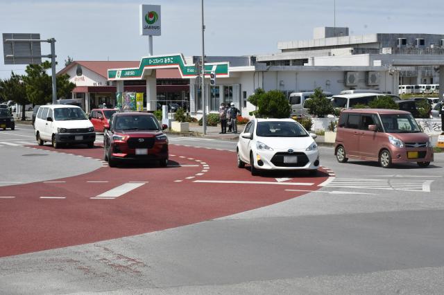 宮古島署によると、同日午後5時時点で同交差点の交通事故の発生報告はないという。同署は車線変更に注意し、安全運転するよう呼び掛けている。