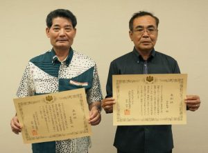 【那覇支社】沖縄地方非常通信協議会(会長・柳島智総務省沖縄総合通信事務所長)の2022年度定期総会・表彰式が20日、那覇市の自治会館で行われ、非常通信の体制確保に貢献した宮古島市と多良間村の2団体を表彰した。多良間村の伊良皆光夫村長と宮古島市の平良勝彦防災危機管理課長が出席し、今後の意気込みも語った。