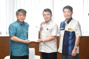 【那覇支社】県離島振興協議会・県過疎地域振興協議会の宮里哲会長(座間味村長)、伊良皆光夫副会長(多良間村長)が21日、県庁に照屋義実副知事、県議会に赤嶺昇議長を訪ね、医師の確保支援など離島・過疎地域振興に関する要請を行った。宮古地区の14項目を含む計105項目の要望実現に向けて県、県議会の協力を求めた。