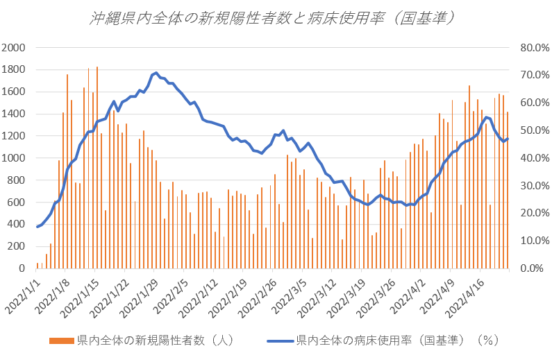 沖縄県内全体の病床使用率(国基準)47.0%、新規PCR検査の陽性率(直近1週間平均)17.7%