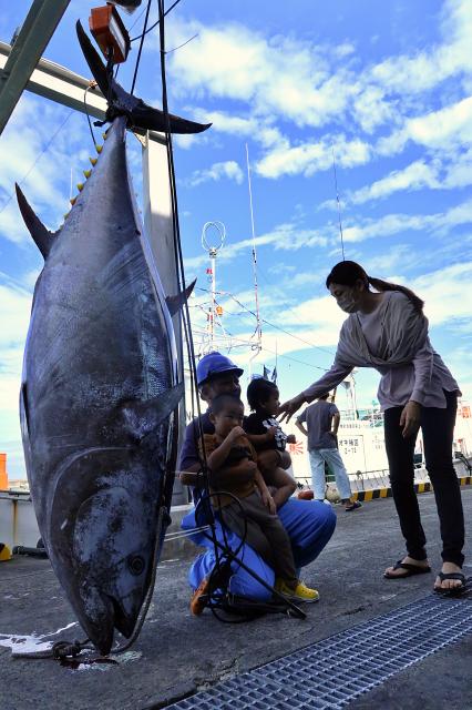 改良丸(本村繁信船長)が23日、250㌔以上のクロマグロ1匹を荷川取漁港に水揚げした。関係者らの盛大な出迎えを受けた本村船長は「今年、宮古で最初のクロマグロの水揚げは譲れないとの思いが強かったのでうれしいね。今は内臓を処理しているが釣り上げた時は250㌔以上あったと思う。きょうはみんなで盛大に祝杯を挙げるよ」と、釣果を喜んだ。