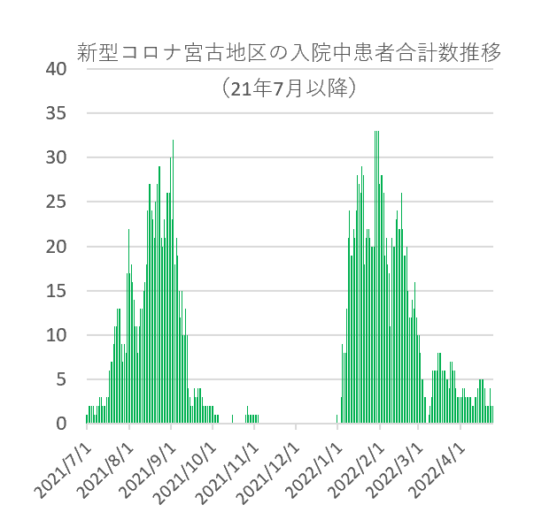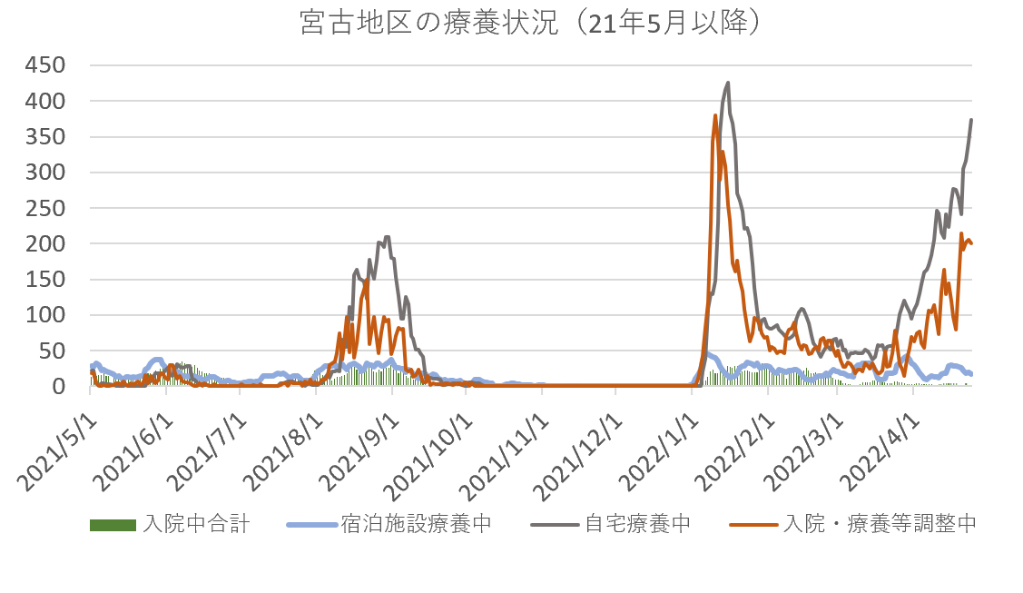市内で入院中のコロナ陽性者は宮古病院の2人(中等症)のみで、民間病院ではコロナ陽性の入院患者はいない状況。一方、宿泊施設療養中は17人、自宅療養者は374人、入院・療養等調整中は201人で、療養者の合計は594人となった。