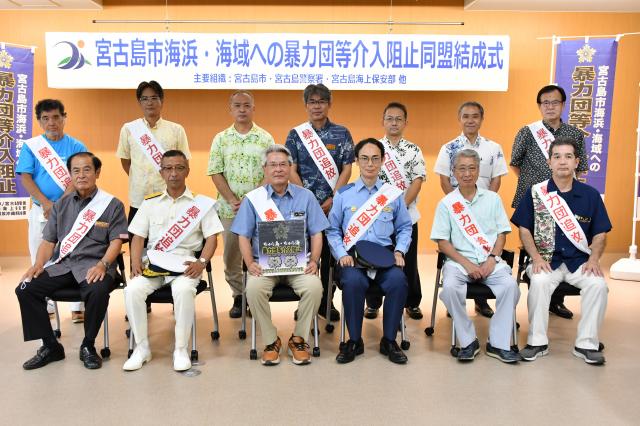 宮古島市海浜・海域への暴力団等介入阻止同盟の結成式が26日、市役所で行われた。市や宮古島警察署などの関係団体が参加し、暴力団等からの不当要求を拒否し、暴力団等のいない安全安心な宮古島市内の海浜・海域に向けて決意を新たにした。同同盟は民間企業なども会員となることが可能で、マリンレジャー業などの企業にも参加してほしいと呼び掛けている。