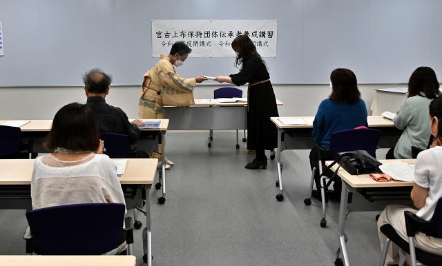 宮古上布保持団体(新里玲子代表)は27日、市役所で2021年度伝承者養成講習の閉講式を行った。新里代表が図案・手くくり講習を修了した松尾由樹さんに修了証を授与し、今後の活躍に期待を込めた。引き続き22年度の開講式も行われ、研修生6人が今後の講習に向けて気持ちを引き締めた。