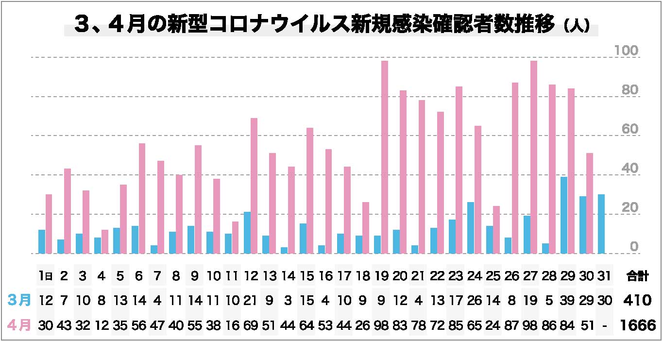 4月に1日の新規感染確認者数が100人を超えた日はなかったが、90人台となった日は2日あった。そのほか80人台が5日、70人台が2日、60人台が3日、50人台が5日あり、1カ月のうち17日で新規感染者数が50人を超えた。3月で1日の新規感染者が最も多かった日は29日の39人で、30人台の日は同日と31日の2日のみだった。