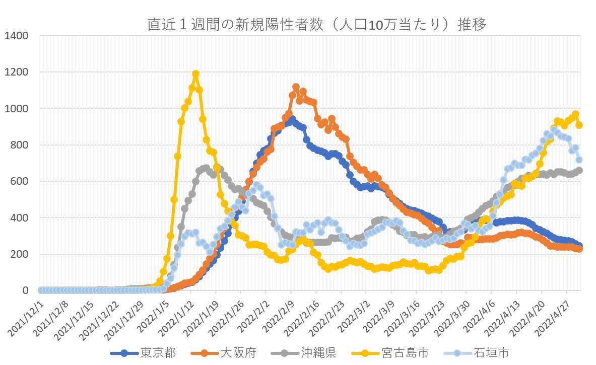 直近1週間の新規陽性者数(人口10万人当たり)は、宮古島市は906.18人で、全国ワーストの県全体(657.66人)を大幅に上回っている。