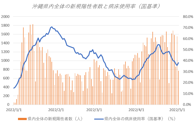 沖縄県内全体の病床使用率(国基準)38.1%、新規PCR検査の陽性率(直近1週間平均)16.8%