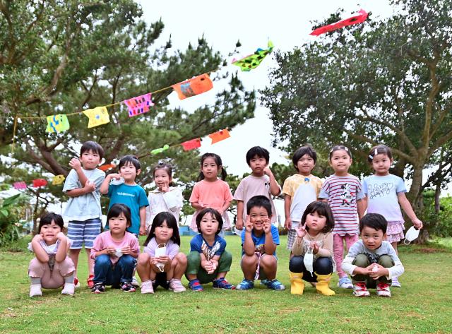 東保育所(川満めぐみ所長)の園児たちが保護者と協力して完成させた手作りのこいのぼり掲揚式が2日、市総合体育館前広場で行われた。小雨が降る中でも元気に泳ぐこいのぼりの下で、4歳児15人の園児たちが楽しい時間を過ごした。